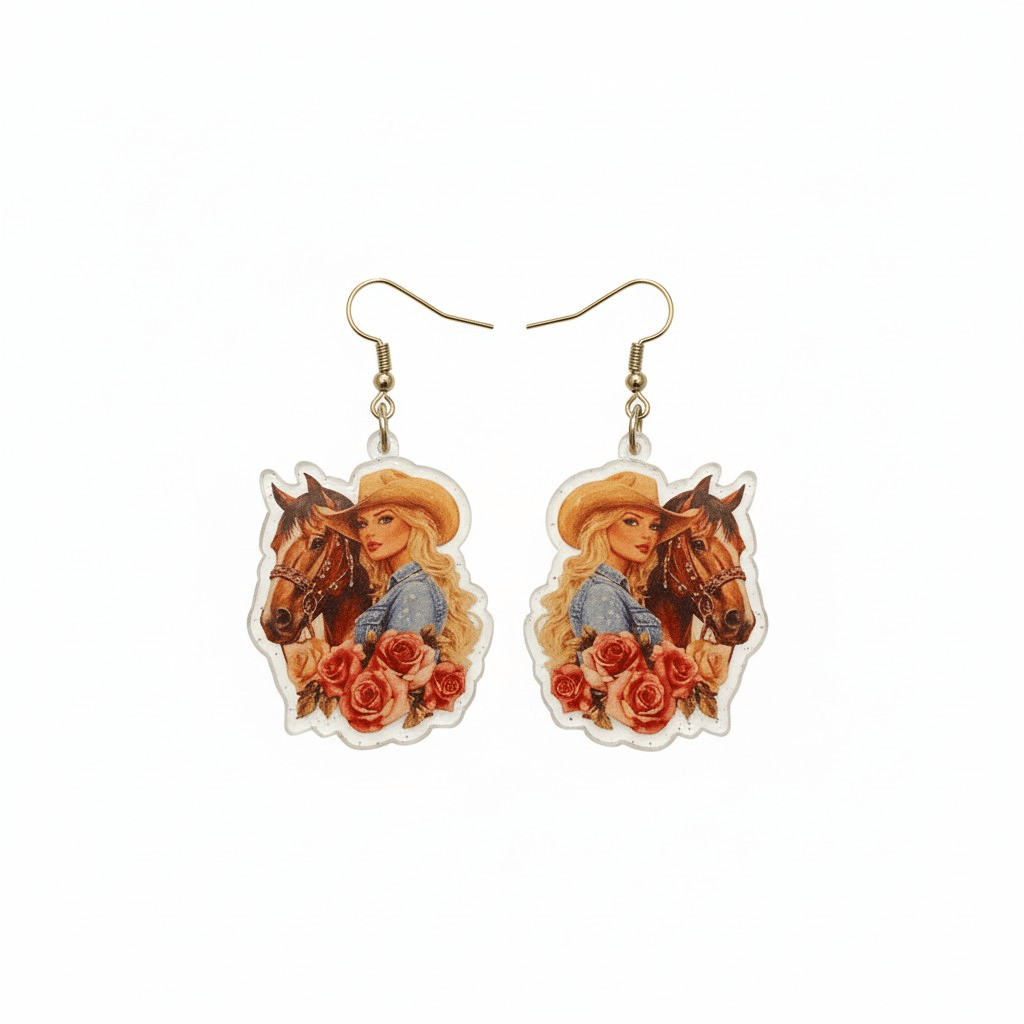 " A Cowgirl and her Horse" earrings are great for any cowgirl! These charms display a cowgirl with her horse. They will make a perfect gift for a loved one!