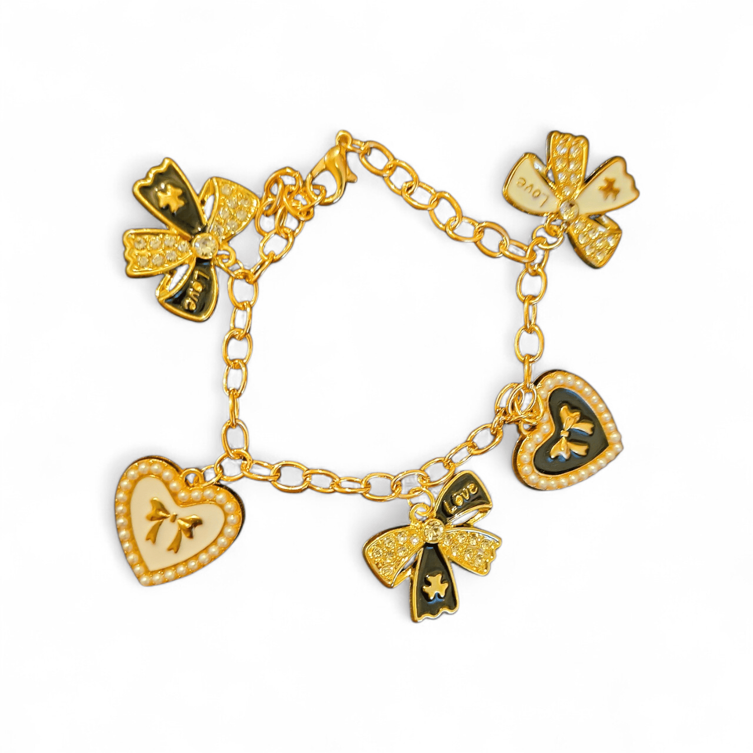 "Hearts and Ribbons" charm bracelets is an eye catching piece! The charms are a mixture of ribbons and hearts.