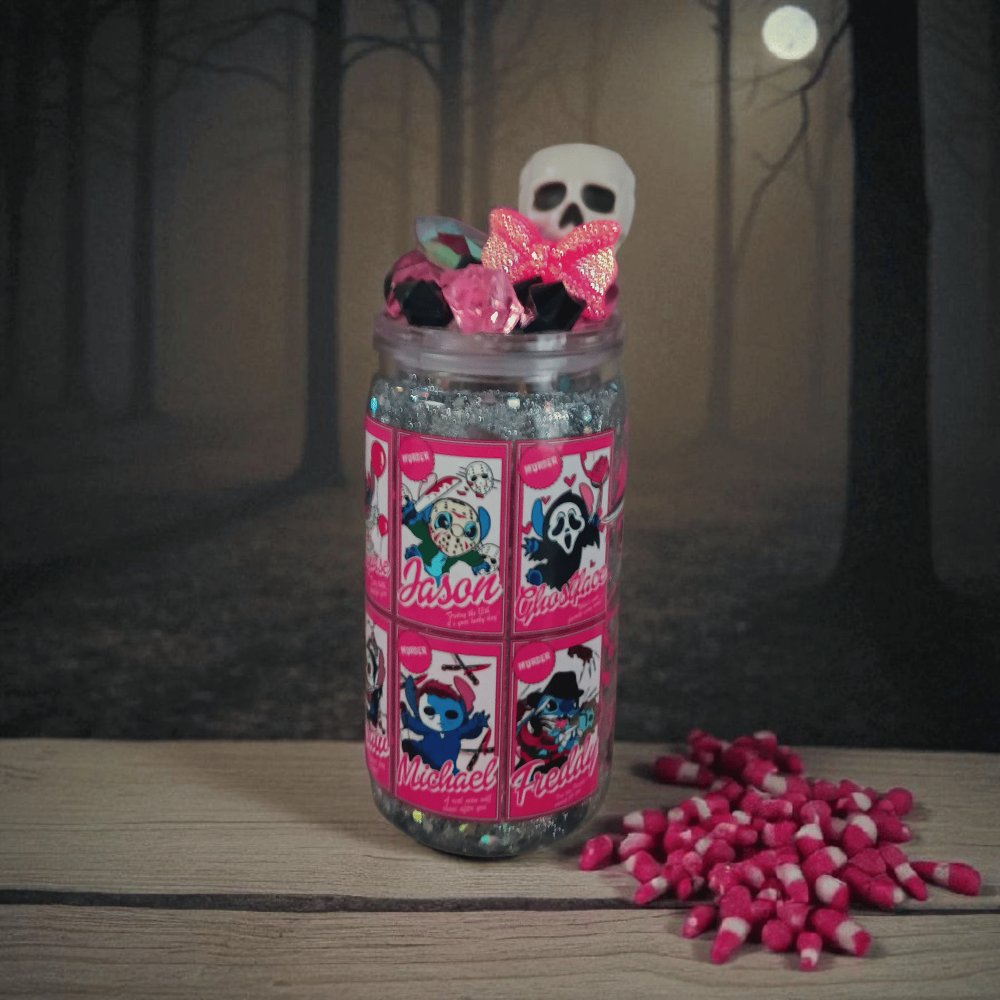 "Princess Horror Collection" displays cute horror characters in various costumes. The top add sparkle and horror combined. Floating glitter is inside when shaken. Please hand wash only to preserve cup. This cup isn't dishwasher safe!