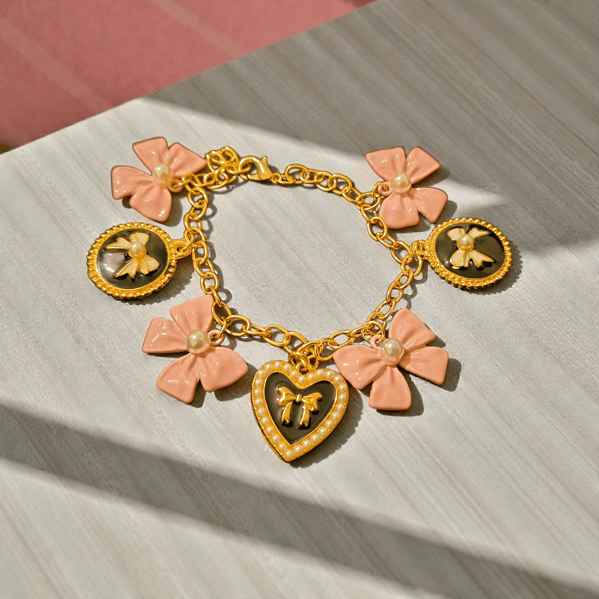 "Ribbon All Around" is a fun and chic charm bracelet for everyday wear. The charms engraved shows small ribbons inside the charm, while the pink showcases the larger ones.
